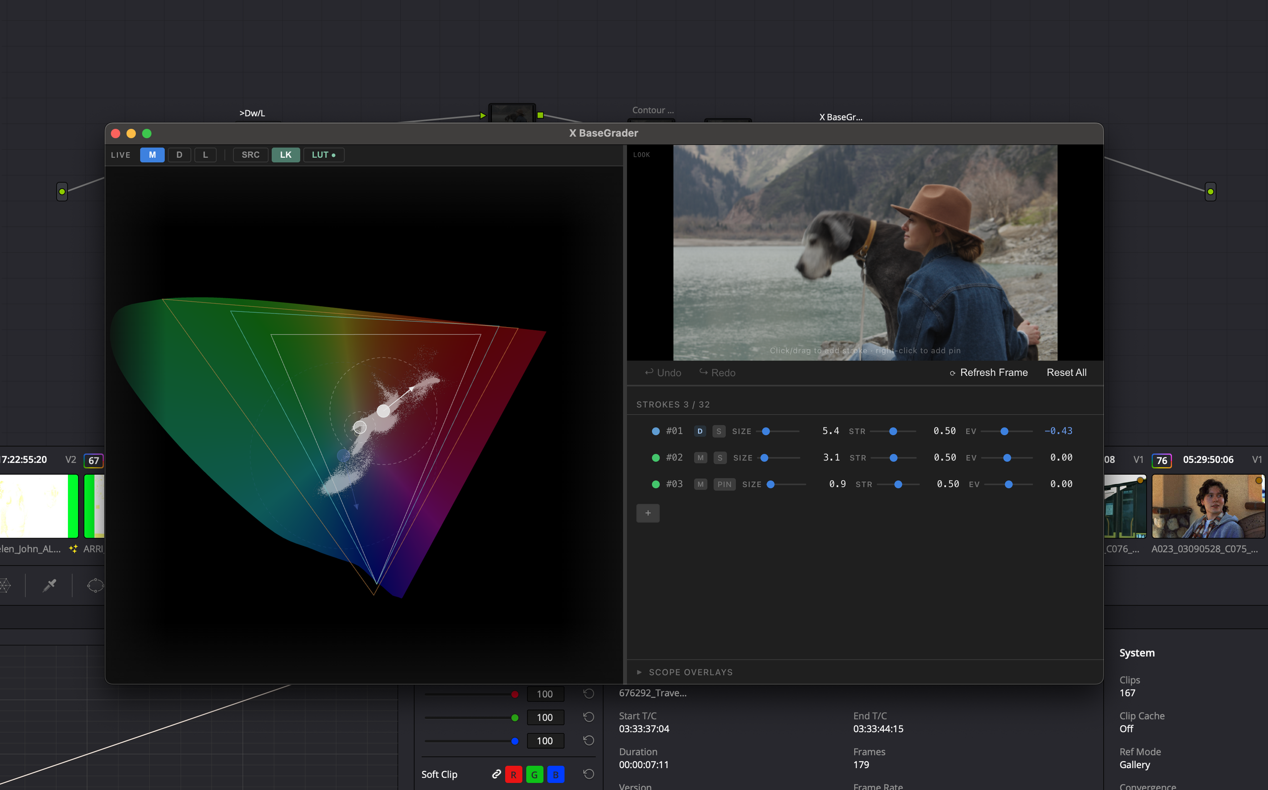 One of the first tools in the X-Grade System is a major improvement over Chroma Warp and is definitely inspired by Baselight’s tools. Draw strokes, Set pins and instantly control your image. With a UI Set in an opponent colour space with easily manipulate your image’s saturation, chrominance & exposure with intuitive controls.