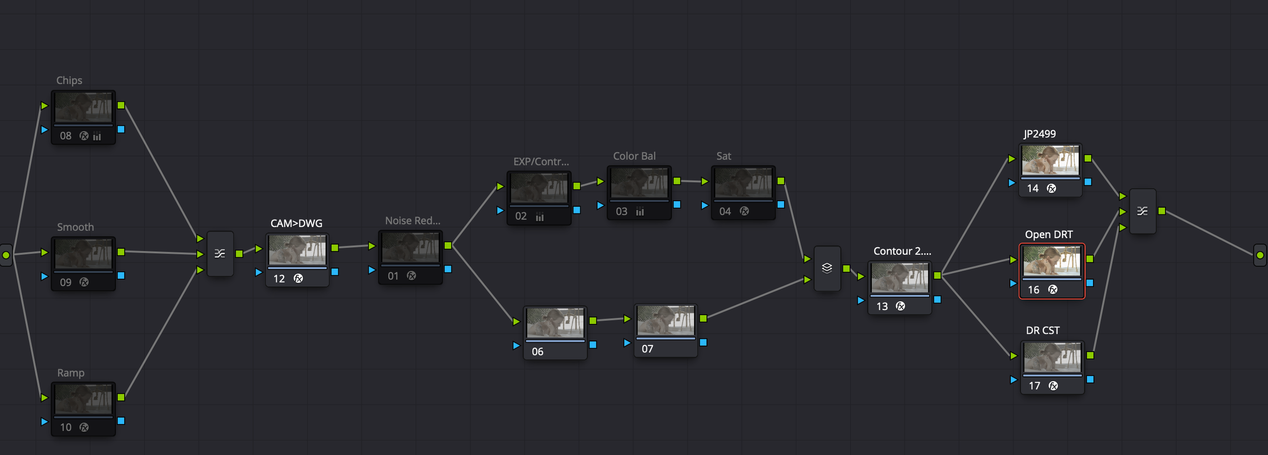 The Node tree puts the chips into a DW/I space using a CST transform from our footage which was Red Log.